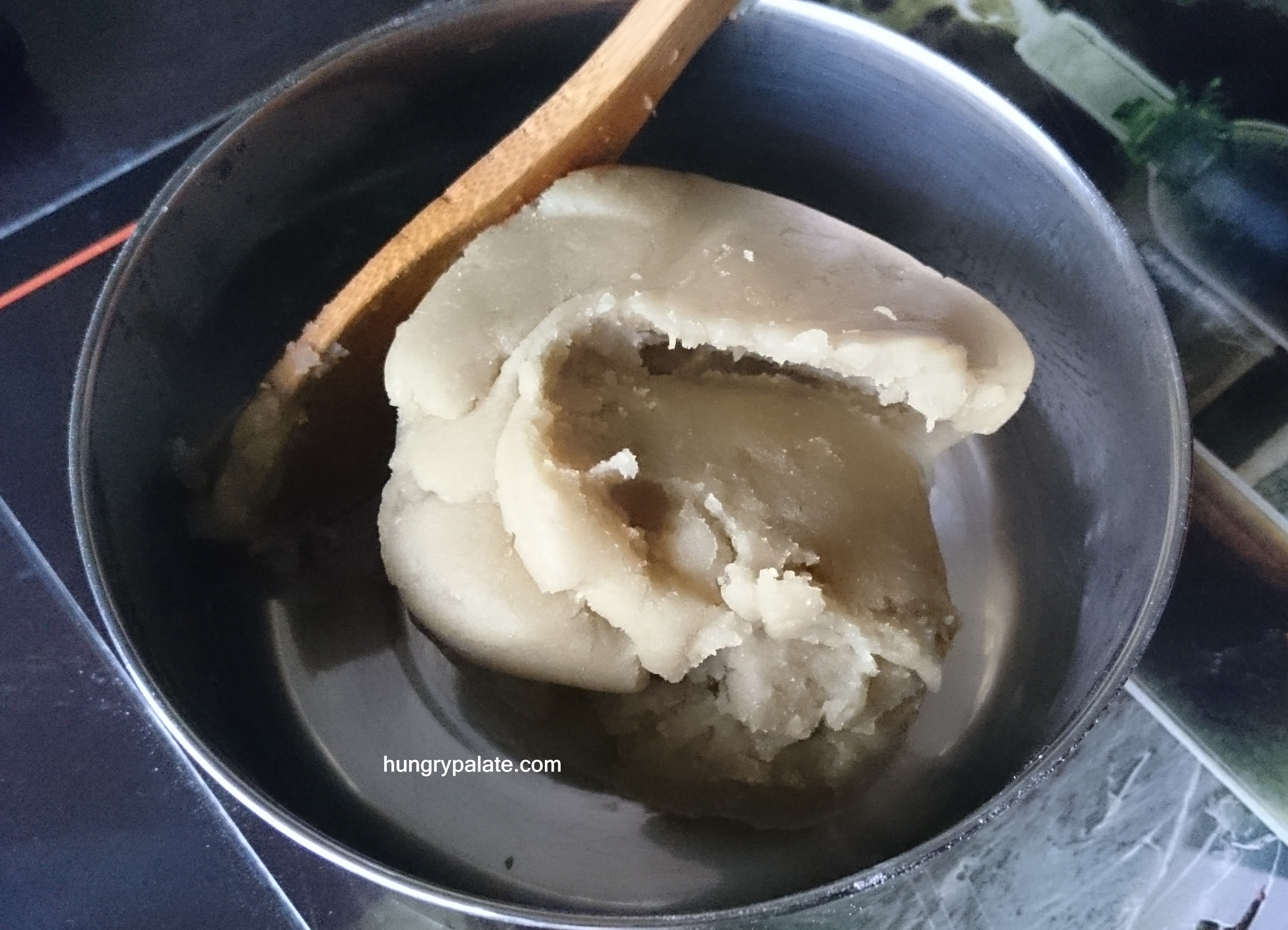 - Once dissolved, jaggery comes to a boil, and add in rice flour by stirring continuously without forming lumps.