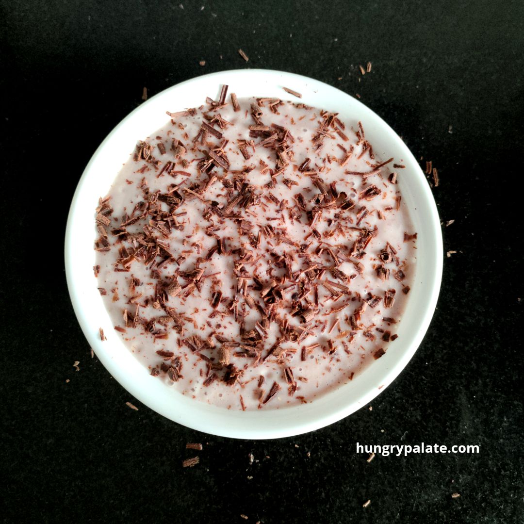 - Transfer the smoothie to a serving bowl, top it with pomegranate pearls, dark chocolate shavings.