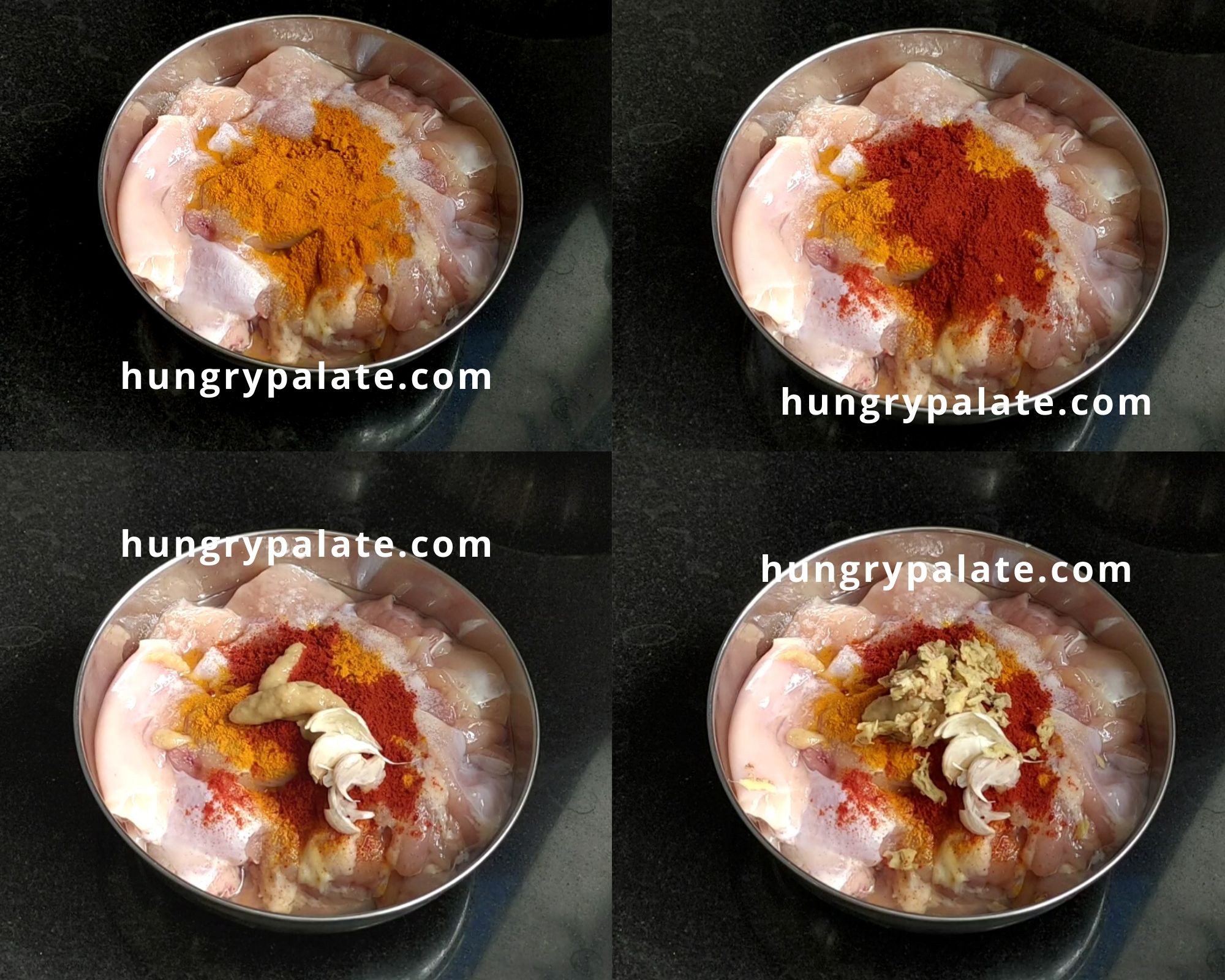 Marinate chicken with salt, turmeric, chilly powder, coriander powder, ginger garlic paste for at least 30 minutes and keep it in the refrigeratorBoneless Chicken Biryani Marination Spices