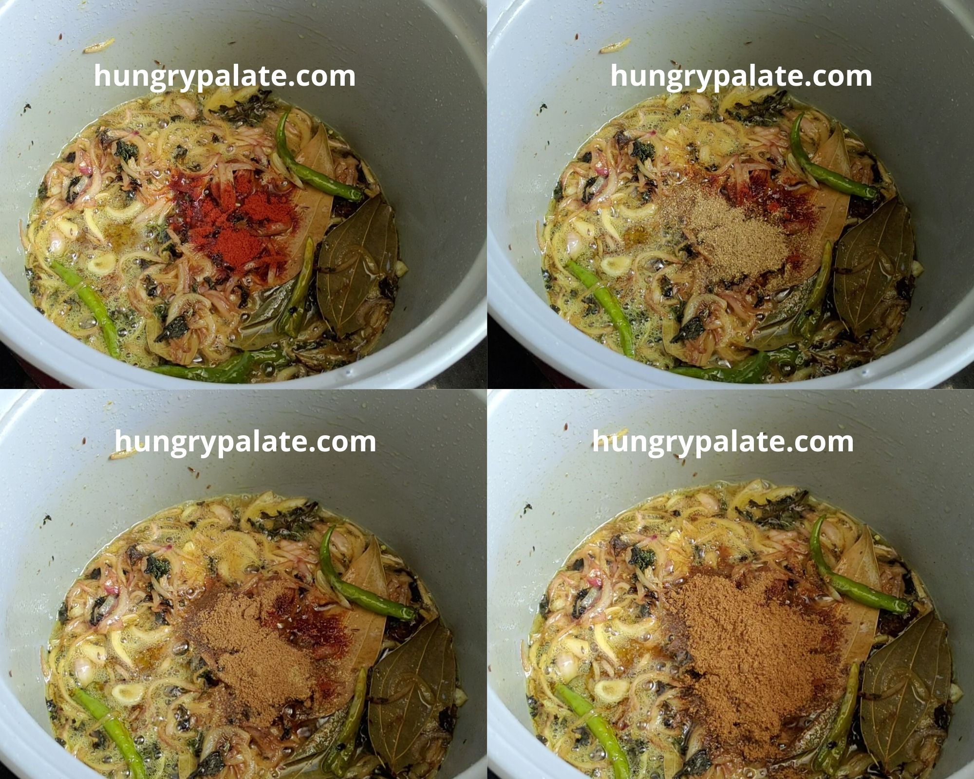 6. Then add all spice powders and fry for 5 mins or until oil oozes out and comes to keep warm. Keep mixing in the intervals to avoid burning the spices.SpicePowders
