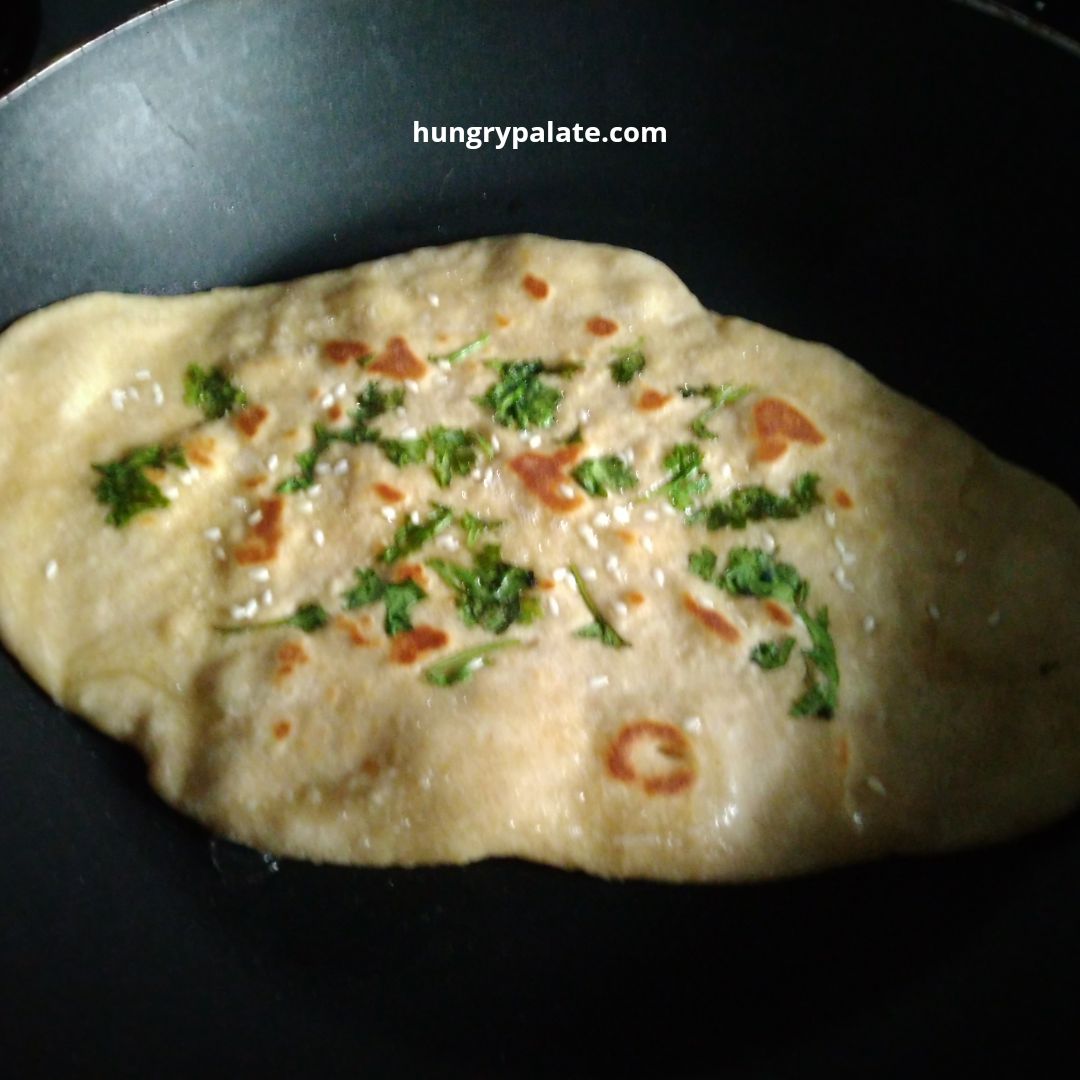 - Sprinkle sesame seeds and coriander leaves on the kulcha. Cook the kulcha on both sides.