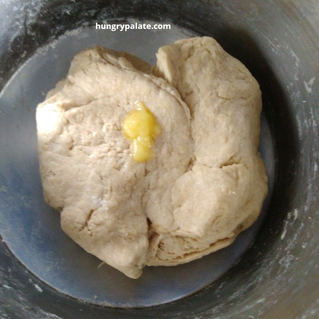 - Add in ghee, knead the dough for 2 seconds and keep aside.