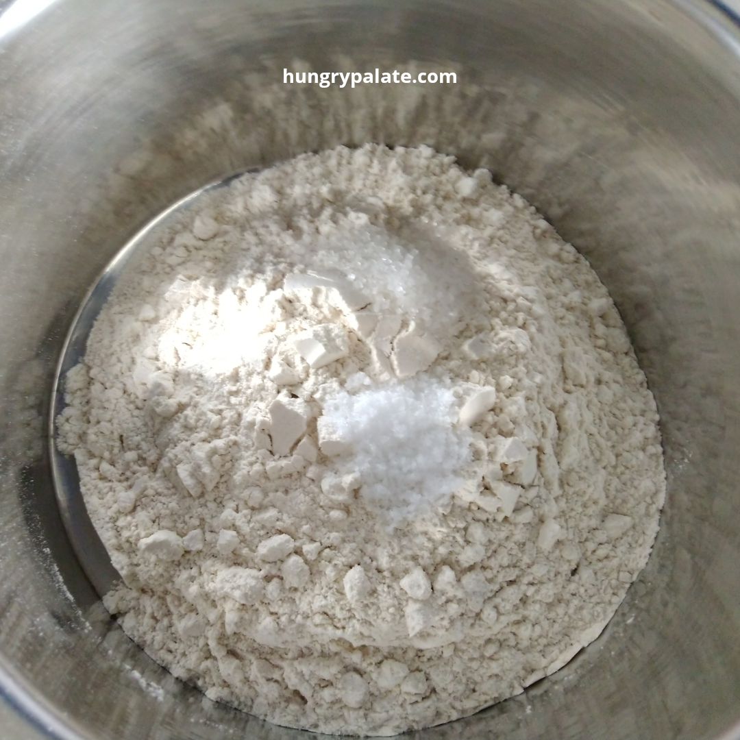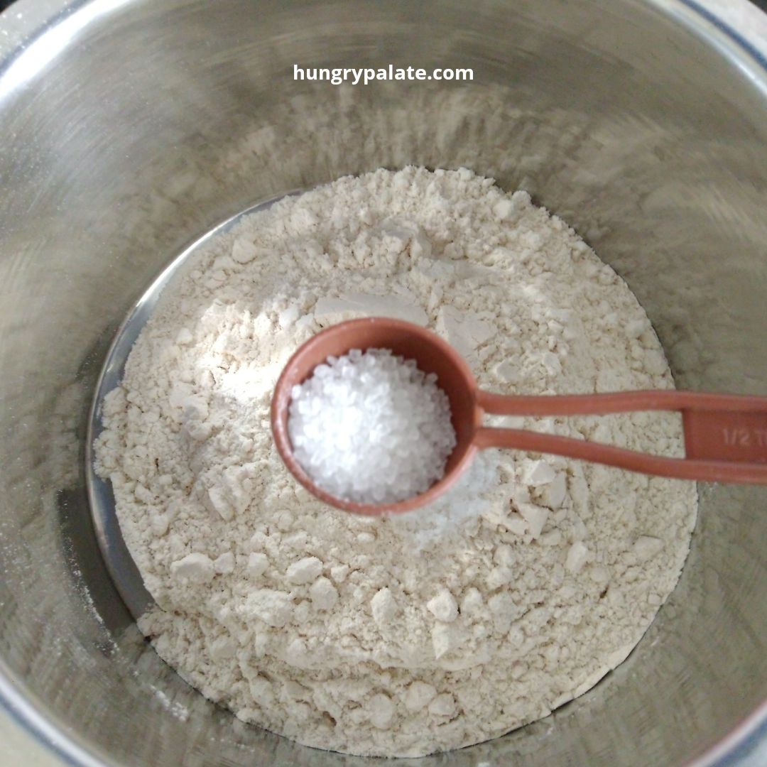 - Take a bowl, add in wheat flour, salt, baking soda, sugar, and mix until well combined.