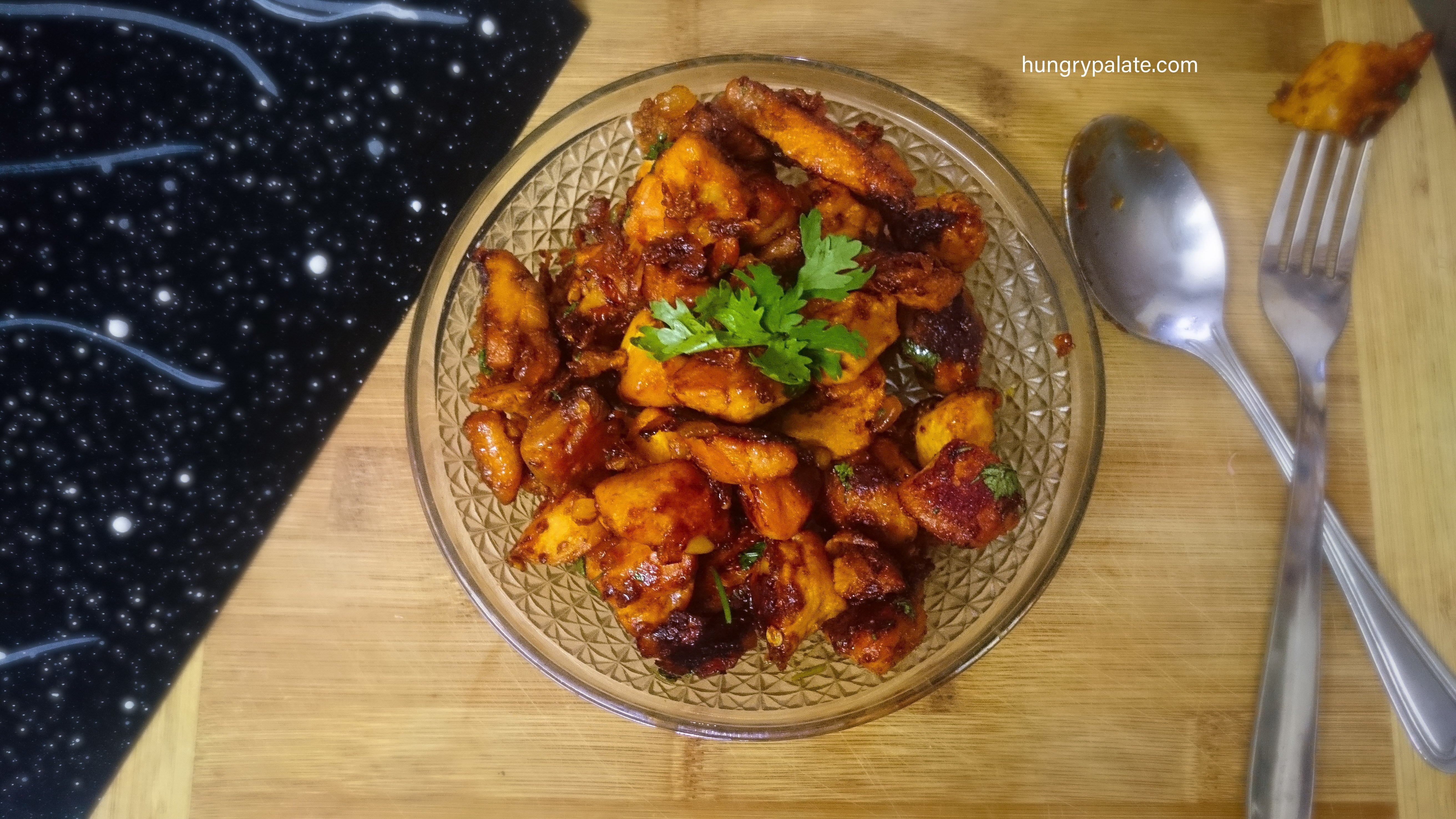 Here I’m not using any drumsticks or bony pieces in this recipe. This is just made with cubed breast pieces which are just shallow fried and tossed in the sauce.