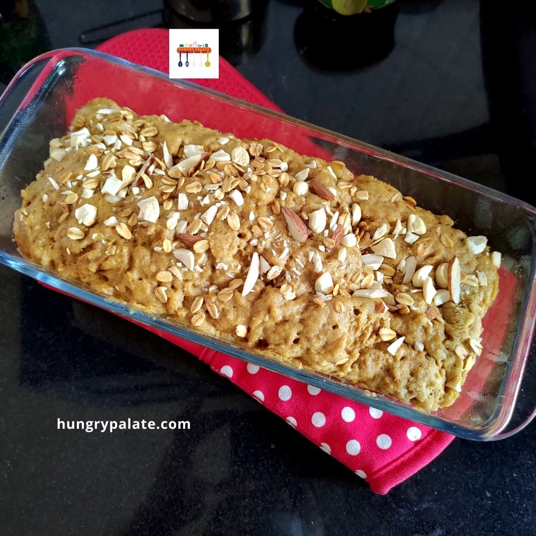 - Grease the loaf dish with ghee/clarified butter and pour the prepared batter/dough in it and sprinkle with ghee roasted oats and nuts