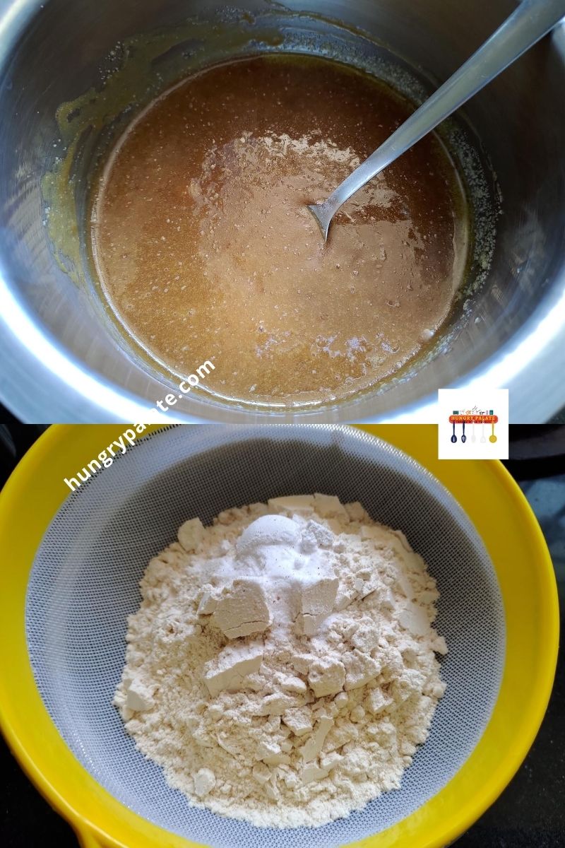 - Sieve the flour, baking powder, baking soda, Cinnamon powder (I grated it) into the above-wet ingredients