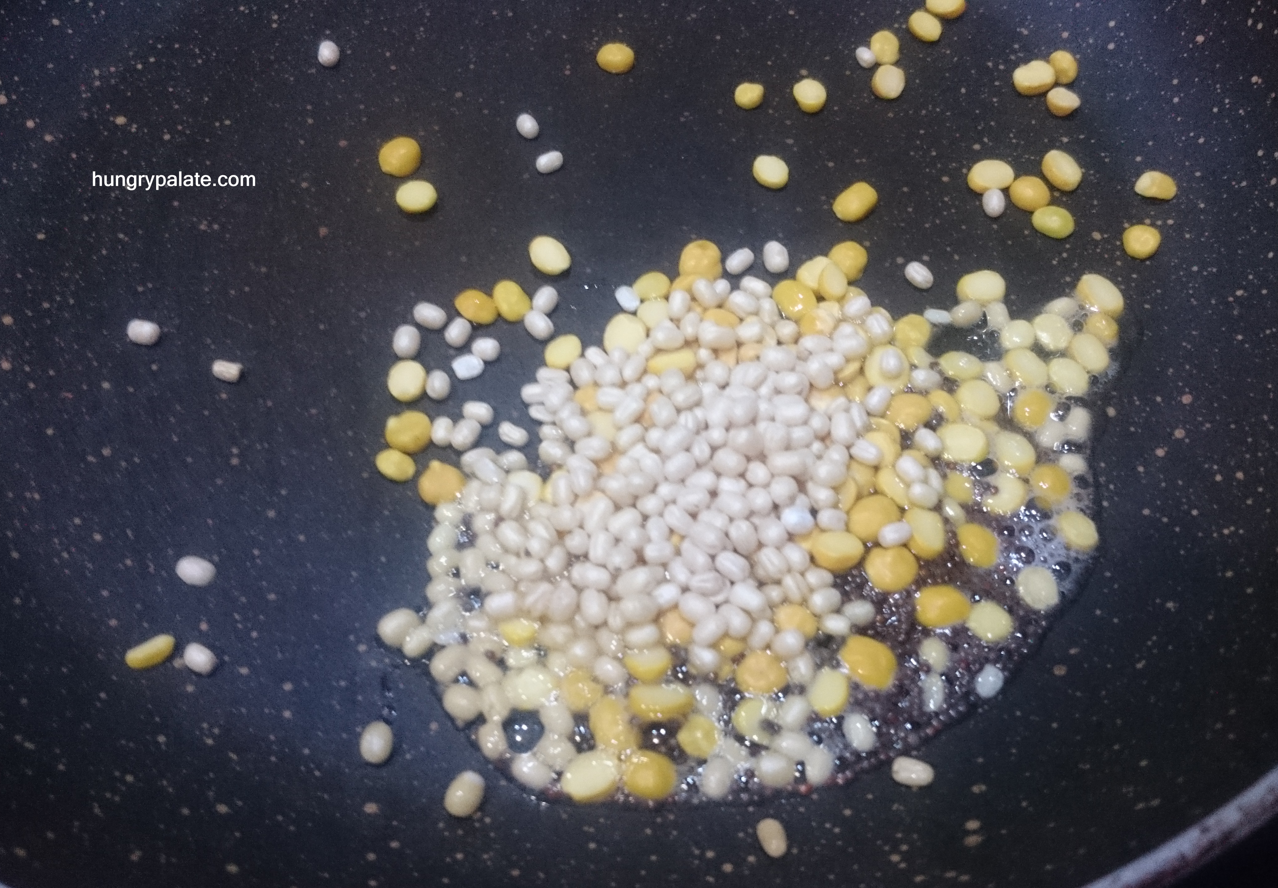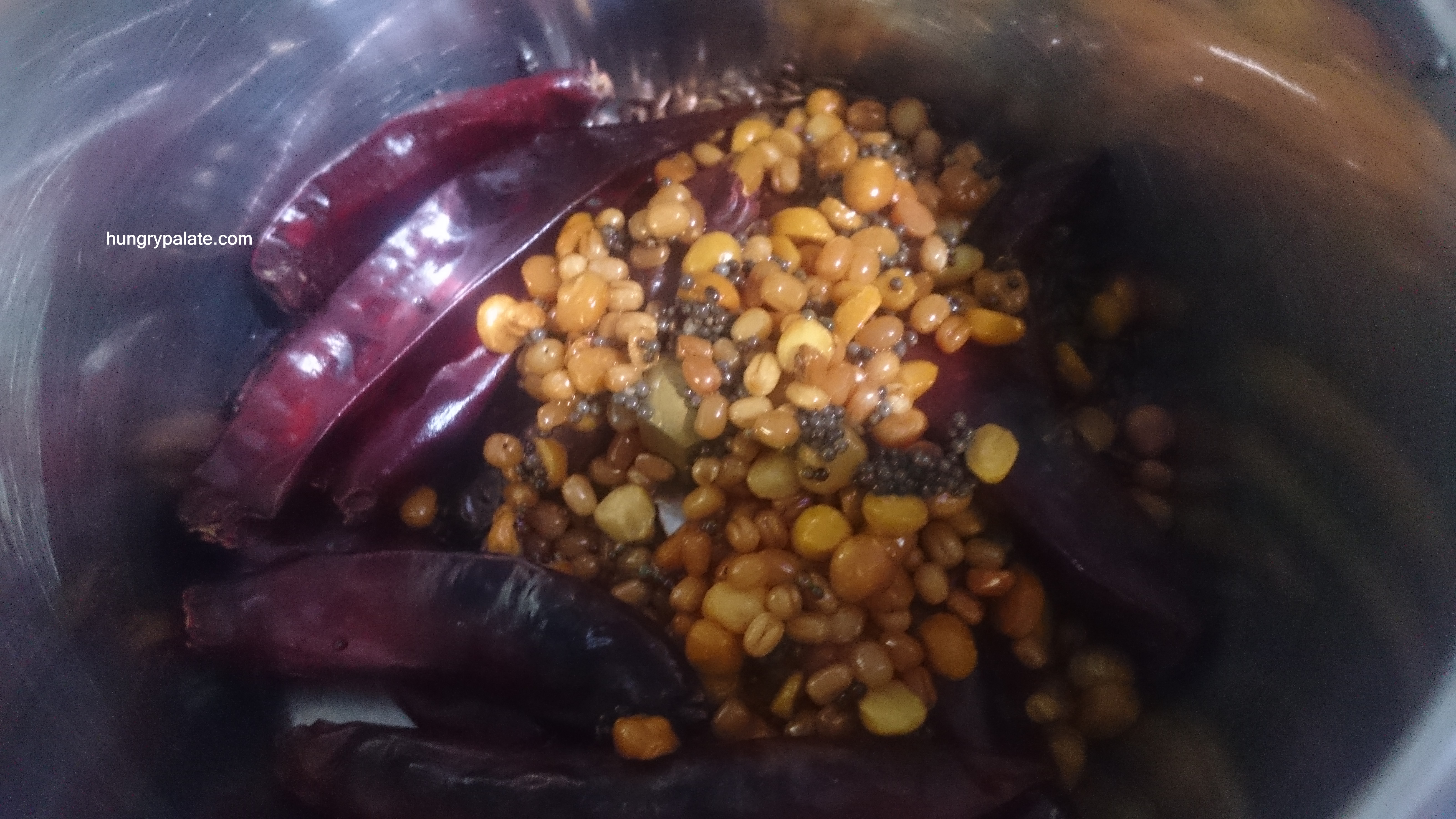 - Now heat the same pan, add in oil, mustard seeds, chana dal, black gram and fry until golden brown.