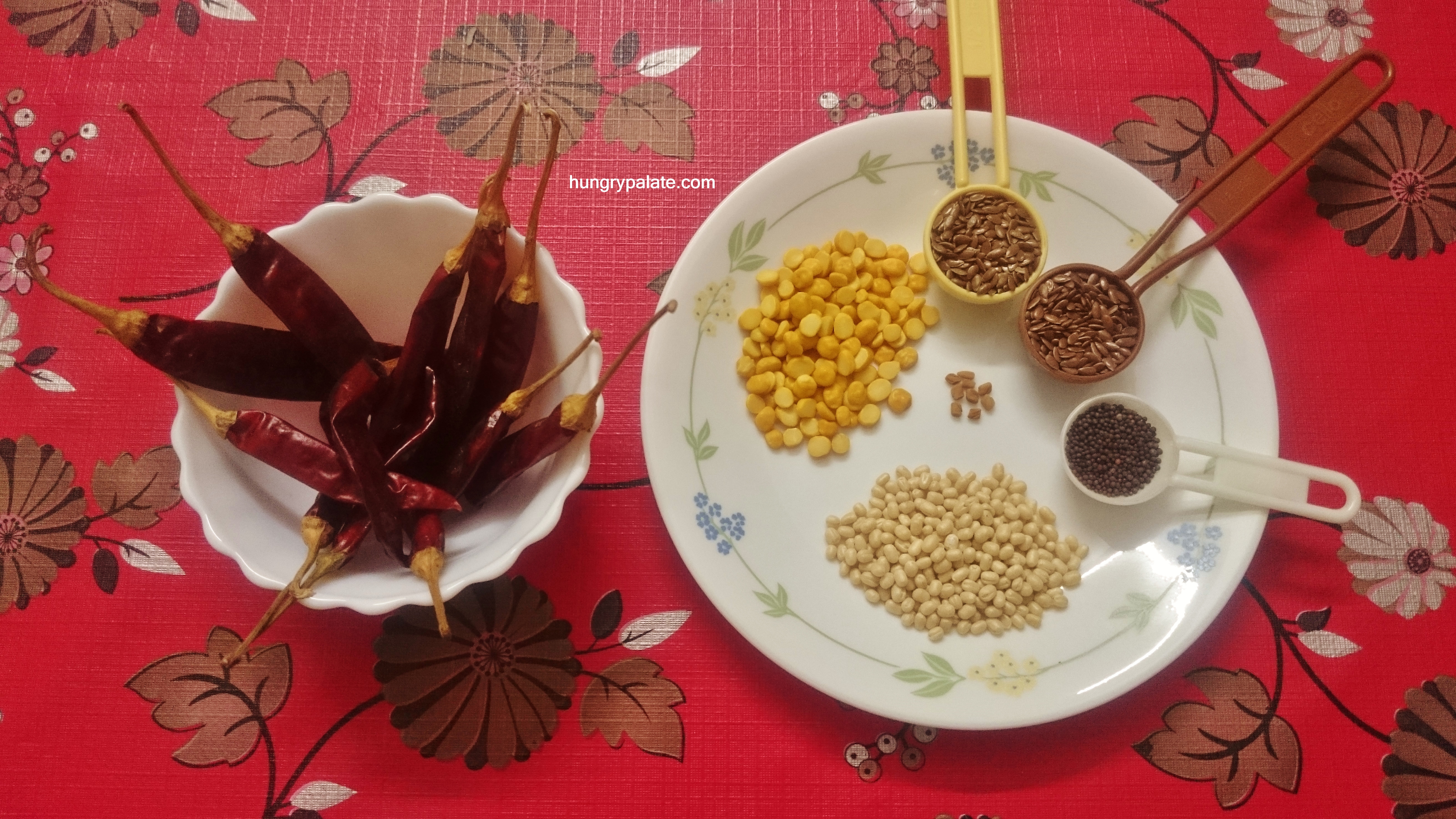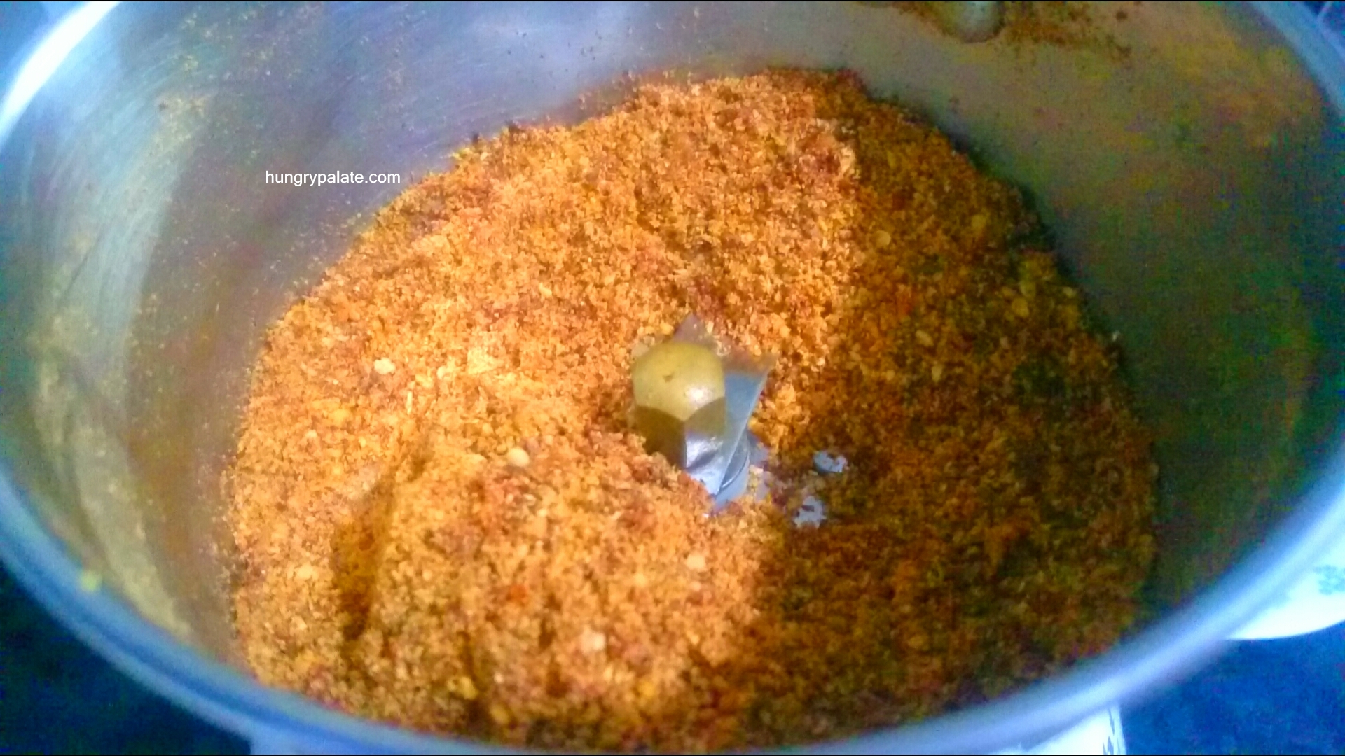 - Now to a blender jar add in flax seeds, mustard seeds, and dal mixture or tempering, red chillies and grind to a coarse powder.