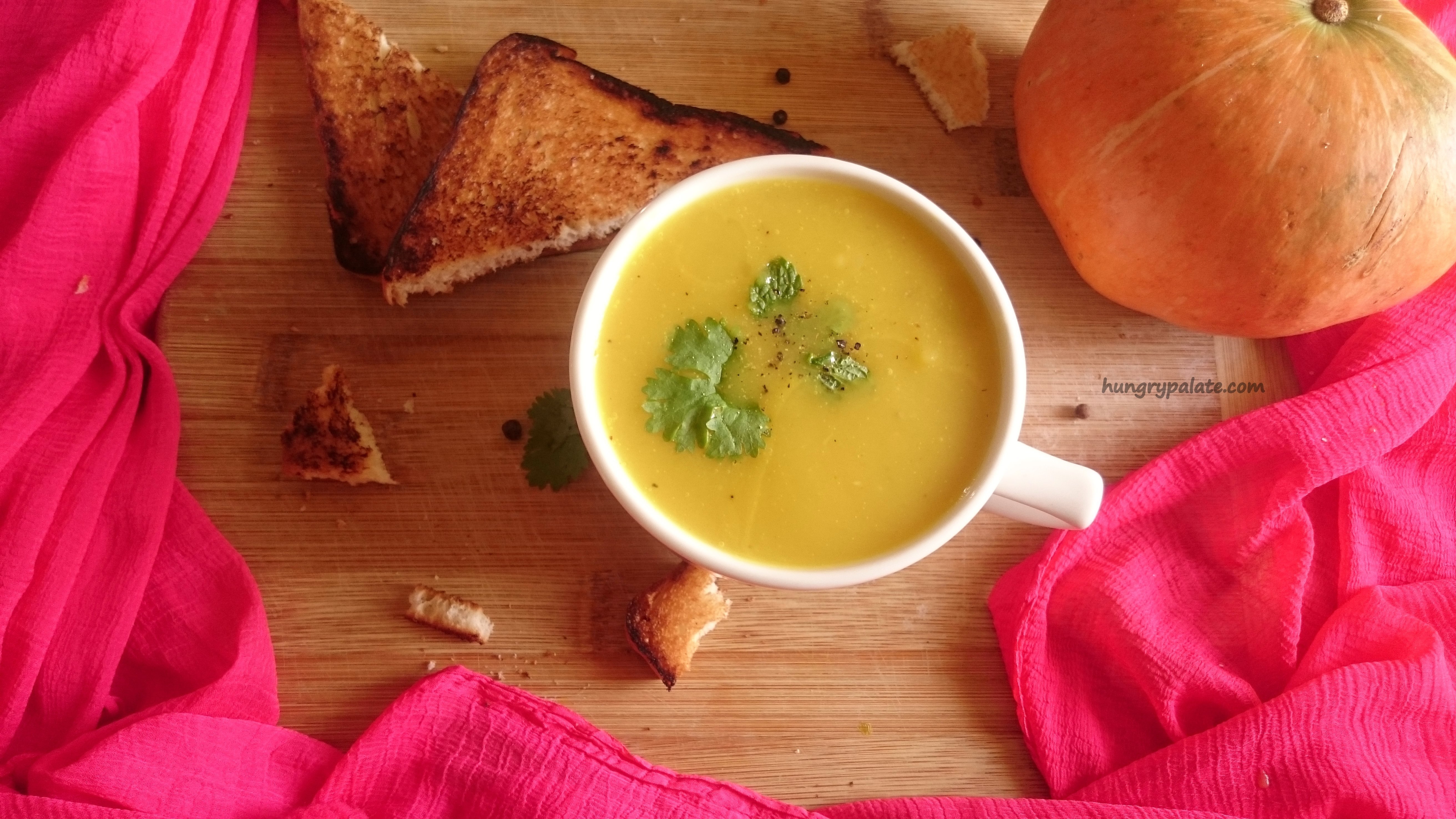 Pumpkin soup without cream and without stock/broth is made very rare as far as my knowledge goes. Pumpkins are rich in fiber, vitamin C and good for heart health. Here, in India, two types of pumpkins, one Ash Gourd/Boodida Gummadikay/Boodi Kumbalkai, as halwa/sweet and the other squash or winter melon in Sambar and huli/pulusu, (a tangy soup) are used.