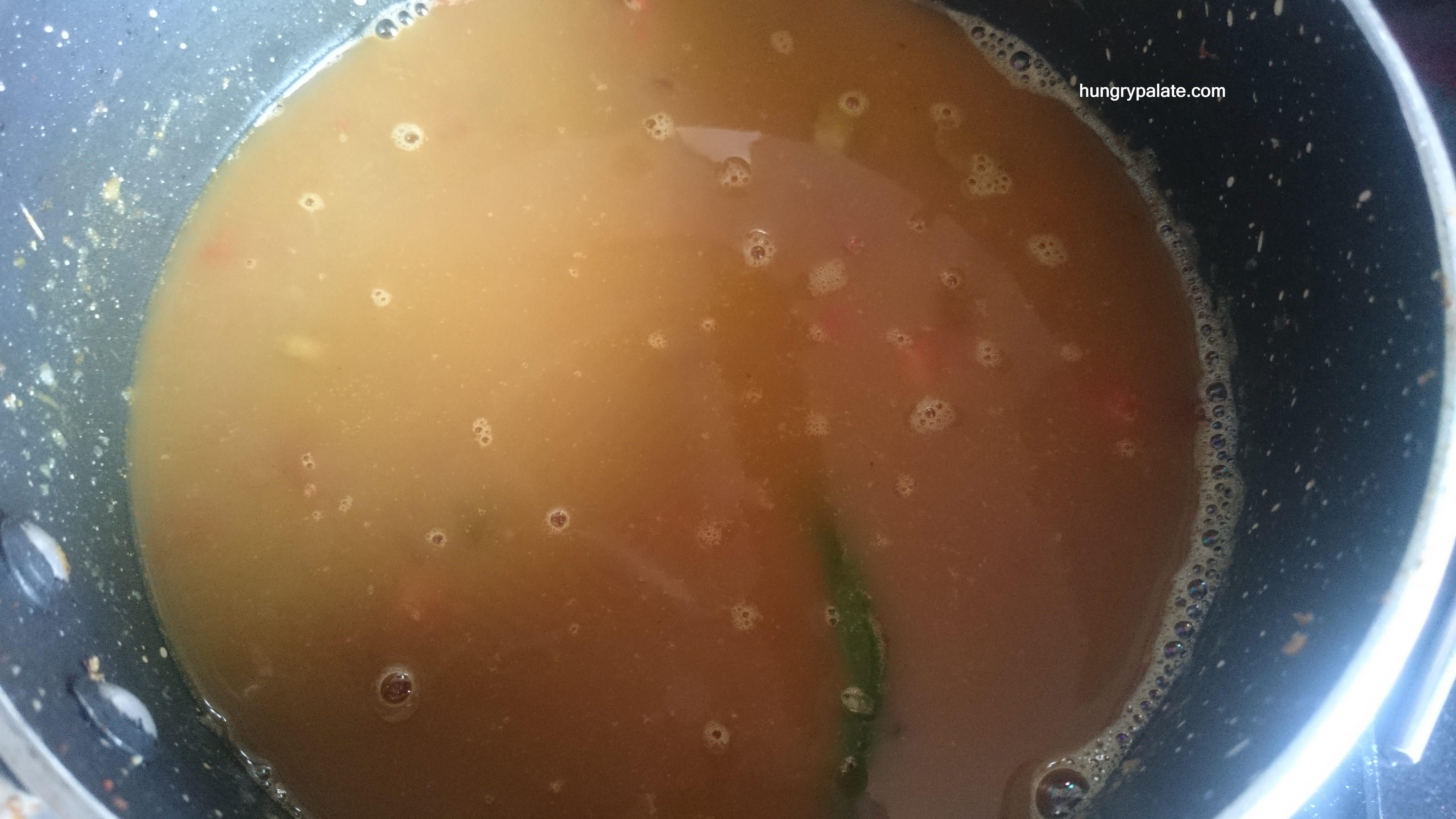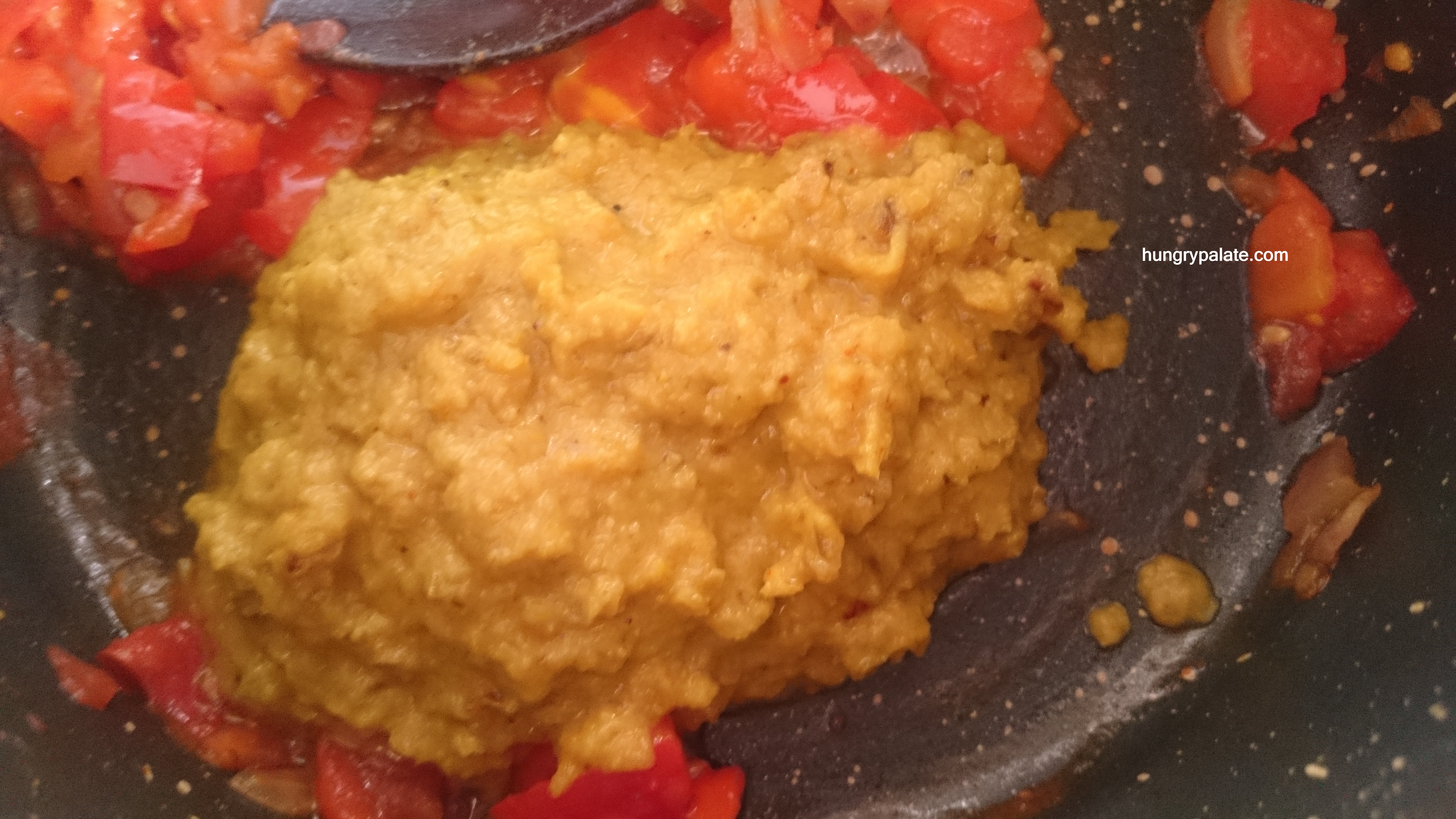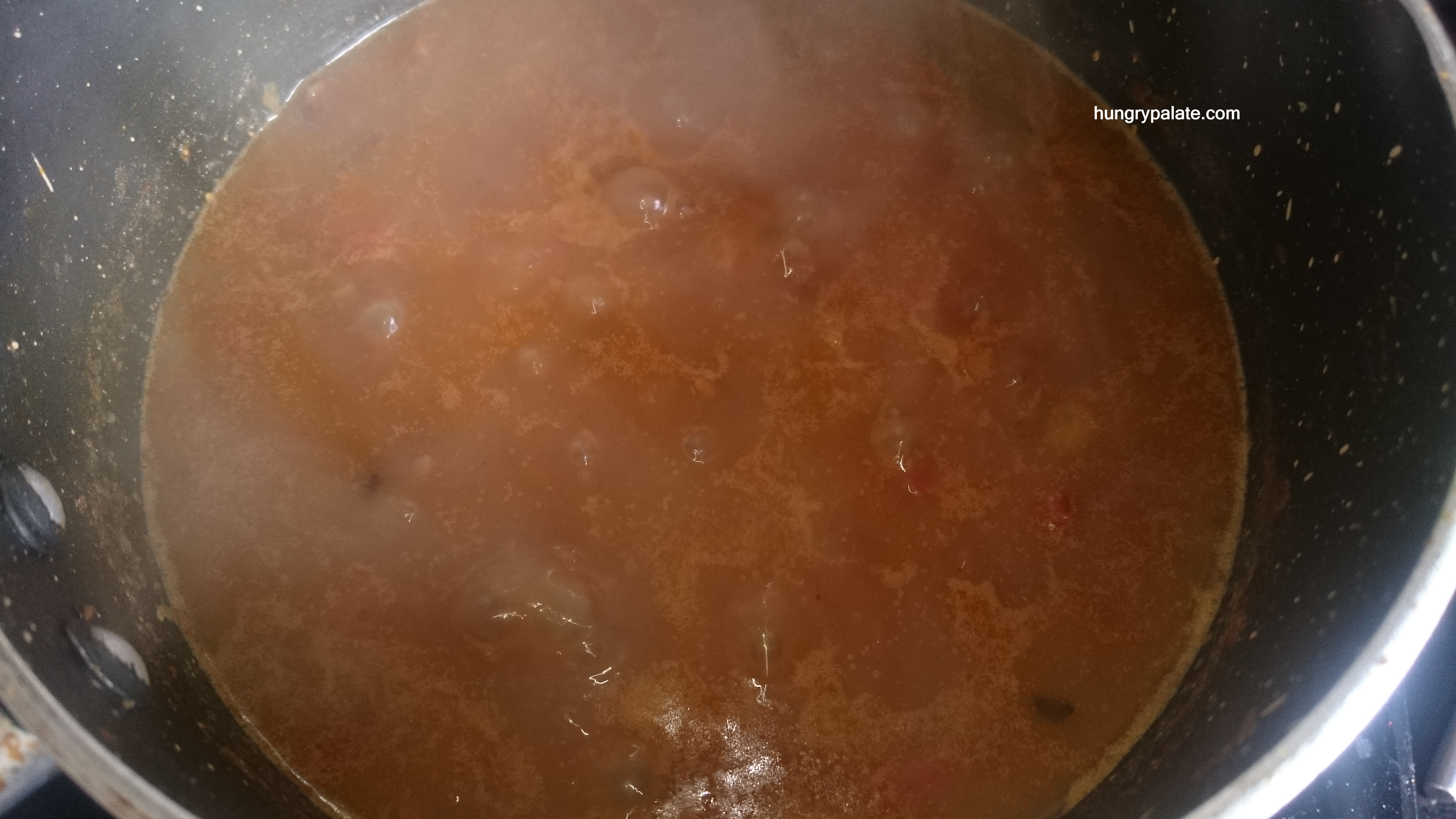 Onion paste into the pan Onion paste & tomatoes - Once fried well, add in the water little by little in which Kidney Beans is cooked.