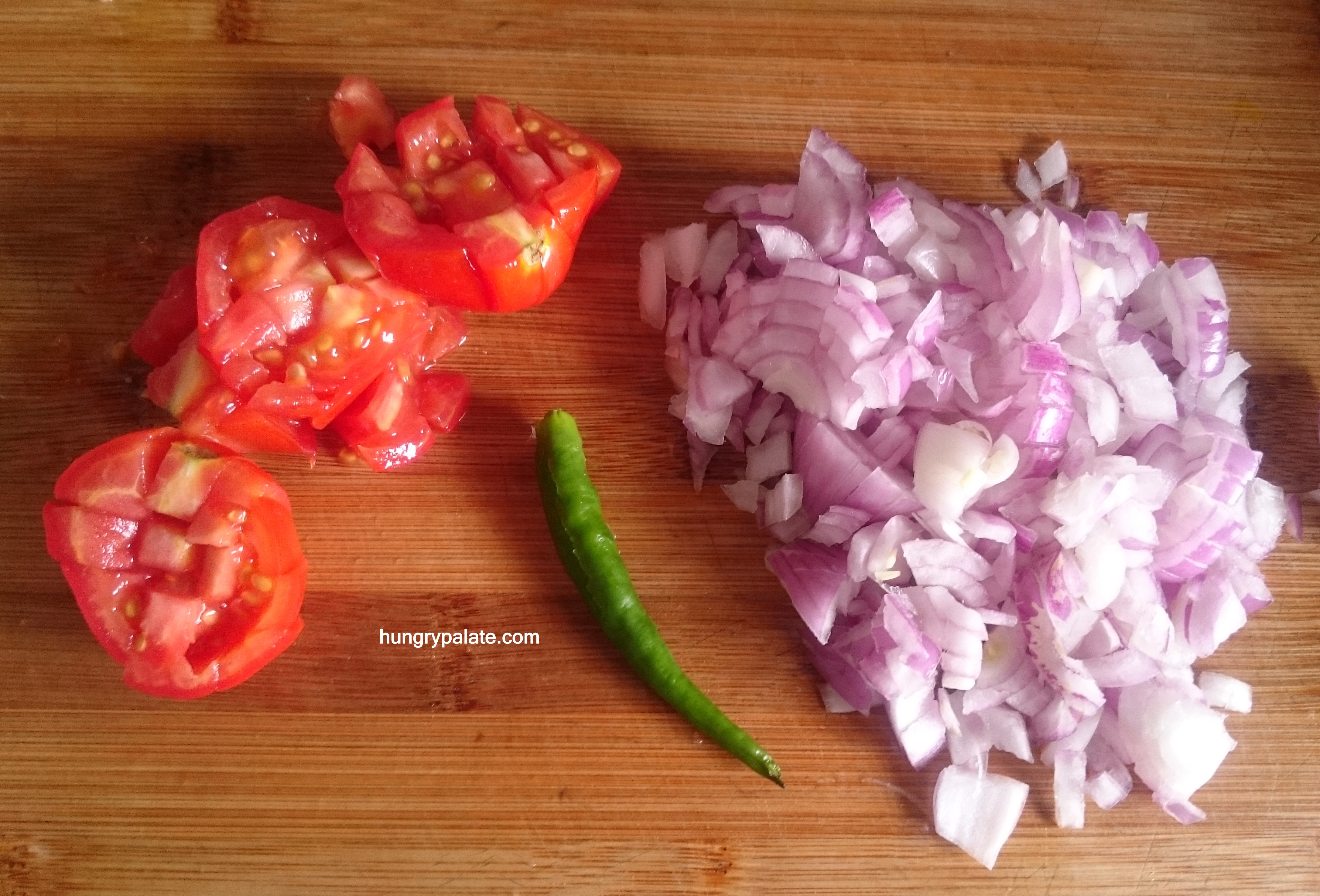 - Firstly, finely chop onions, tomatoes, slit the green chilly and keep aside.