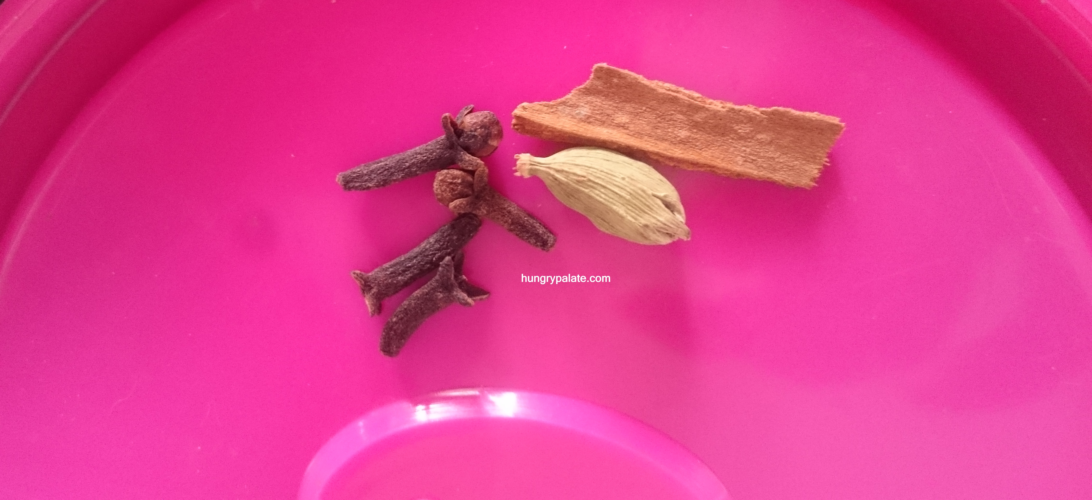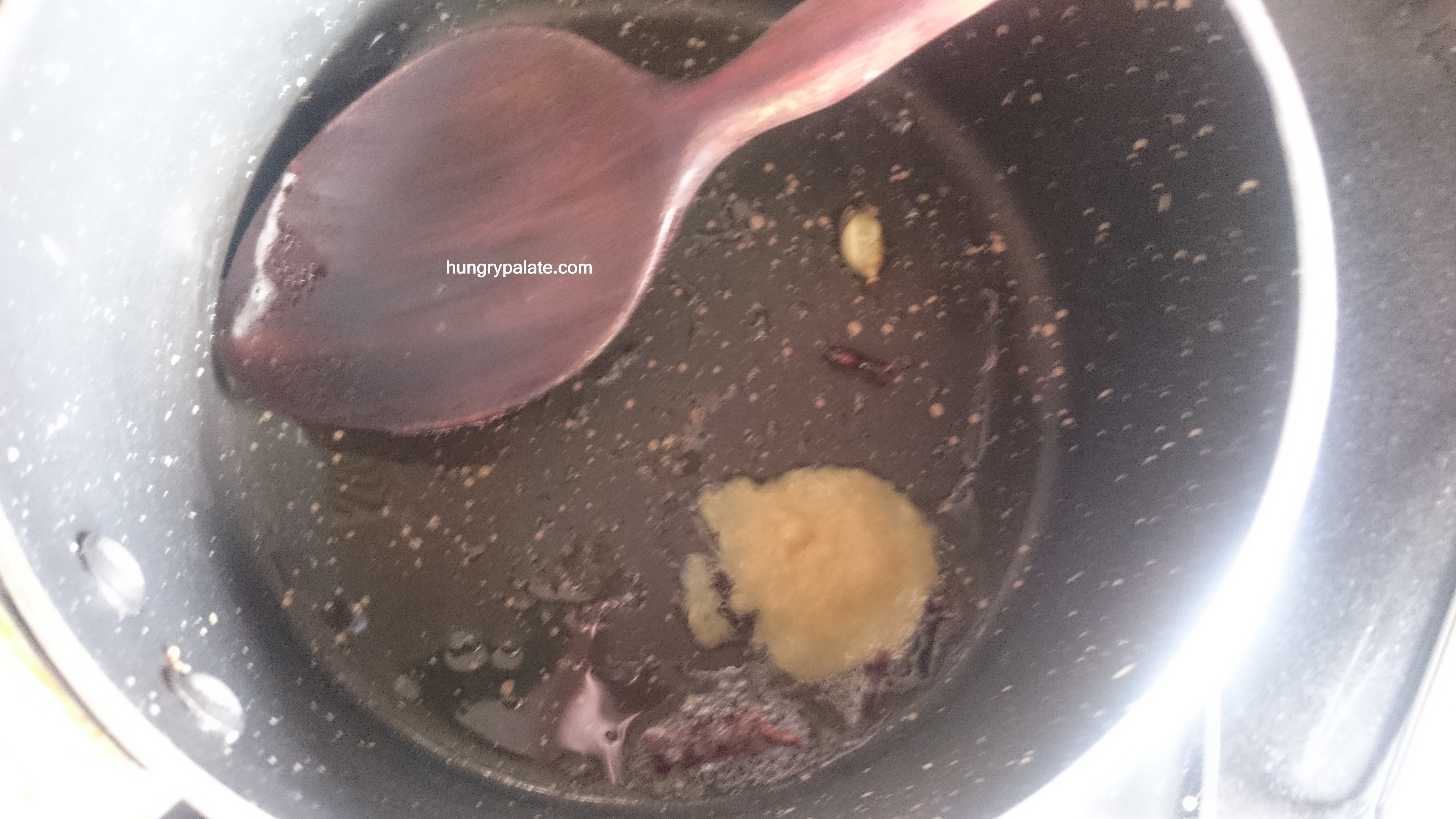 - Heat a saucepan or pan, add in 1/2 teaspoon oil. Once the oil is hot add in cloves, cinnamon, cardamom, ginger garlic paste and until the raw smell goes off.