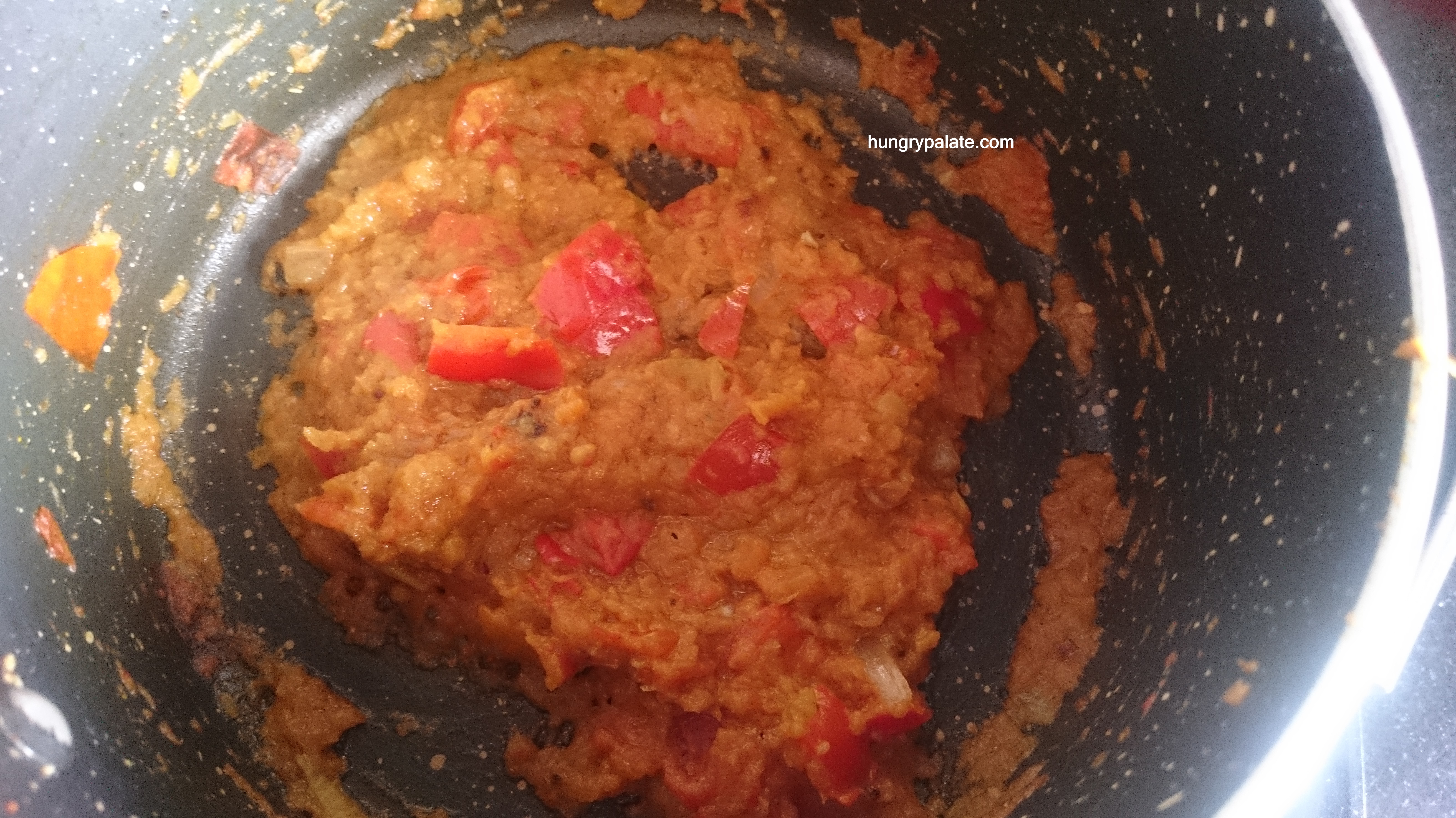 - Add onion paste to the tomato mixture and fry until oil oozes out.
