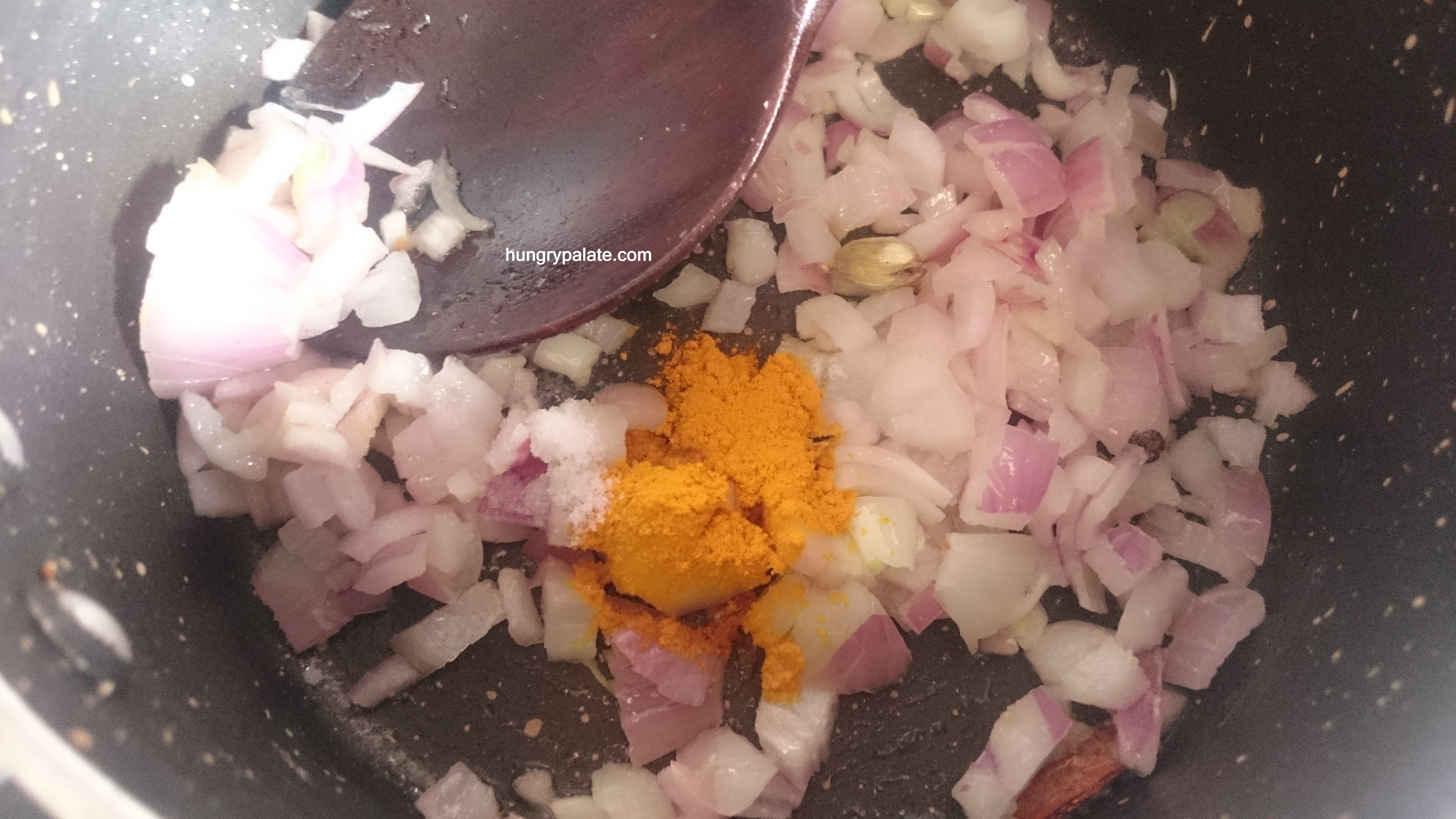 Oil Spices and Ginger-garlic paste - Once fried add in 3/4th chopped onions, turmeric powder, salt and fry until translucent.