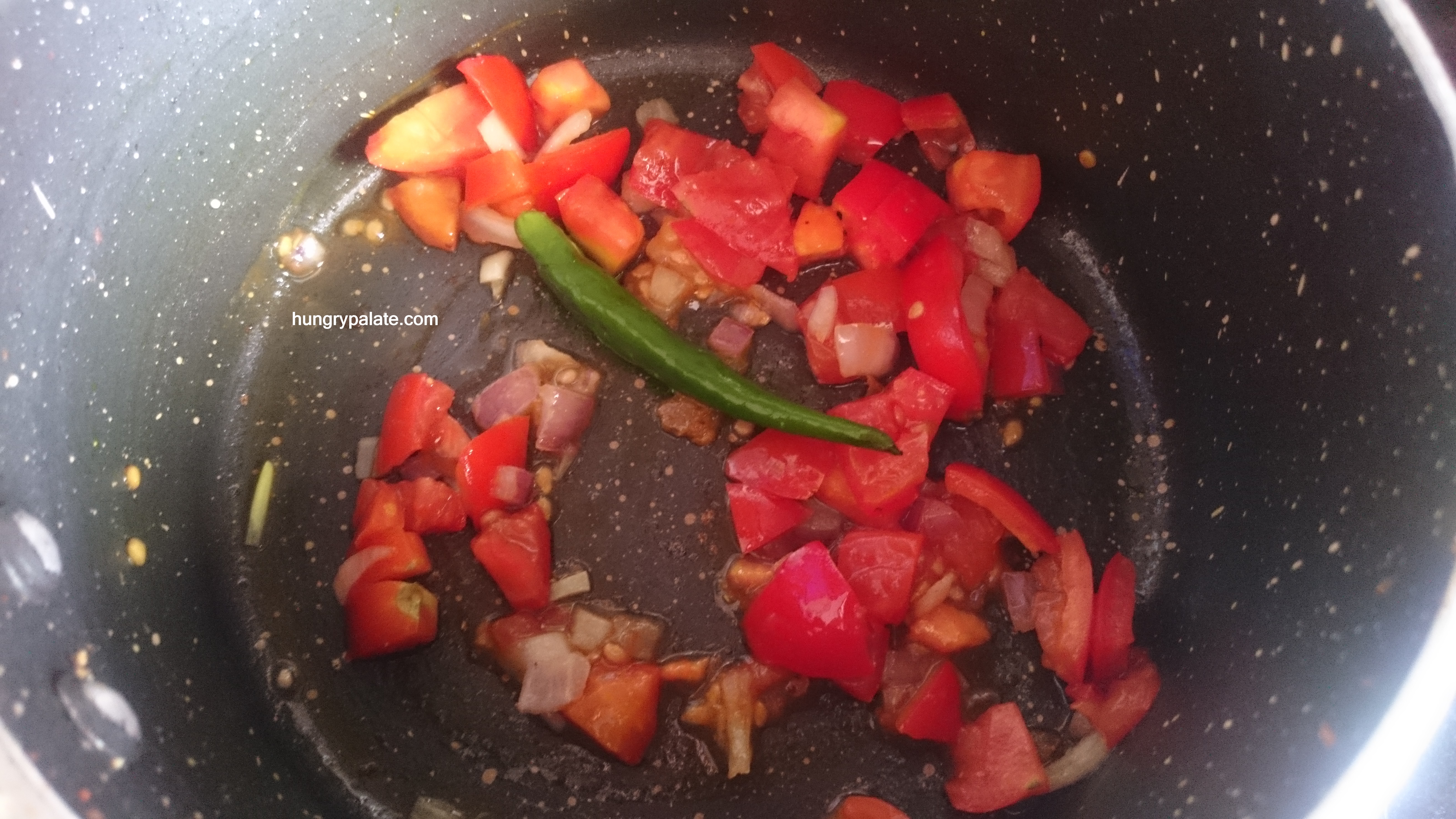 - Meanwhile, take the same pan, add in remaining oil, onions, green chilly, tomatoes and fry until cooked or tomatoes become soft.