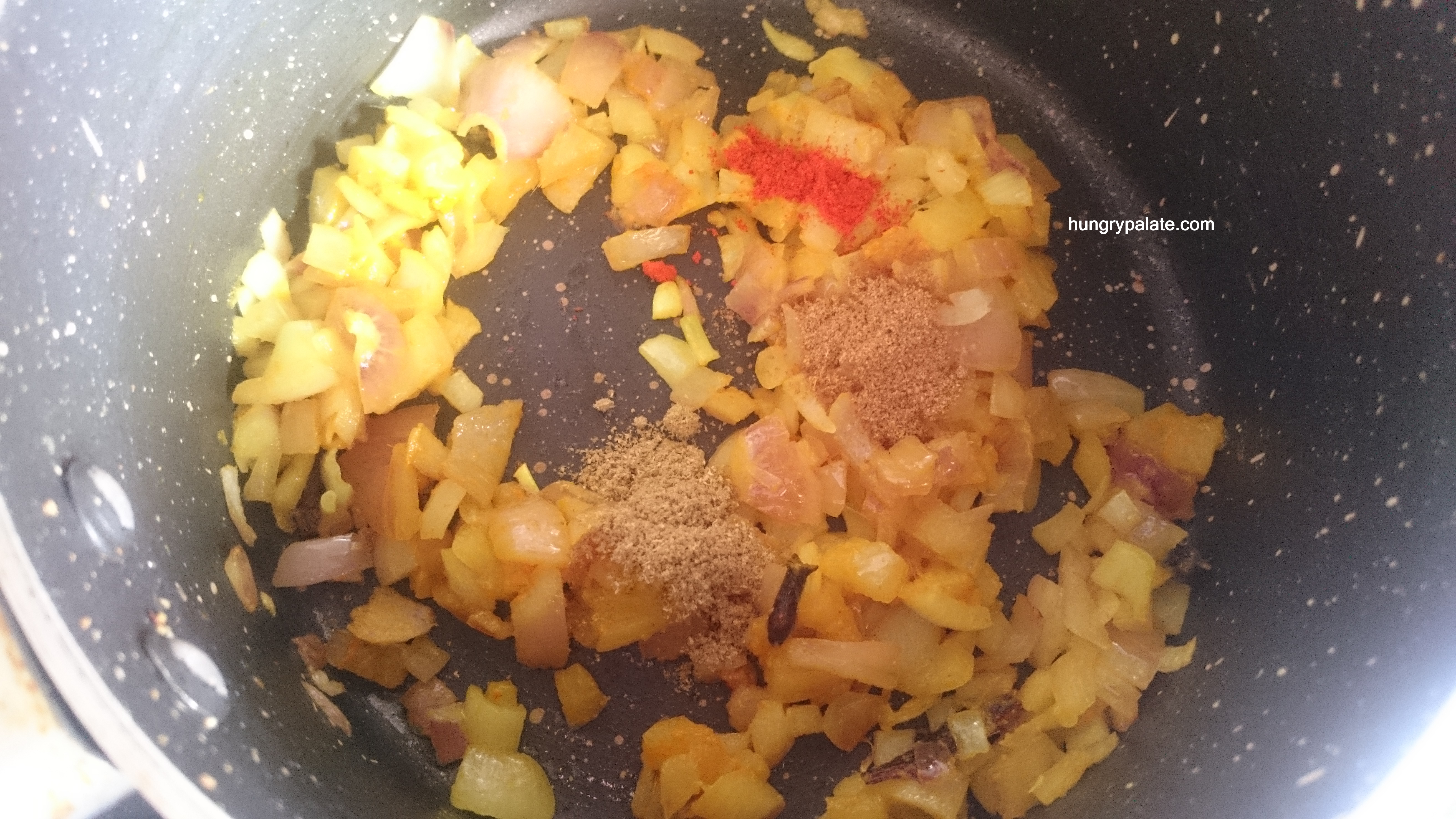 - Now add in red chilly powder, coriander powder, cumin powder, garam masala and fry until masala raw smell is reduced.