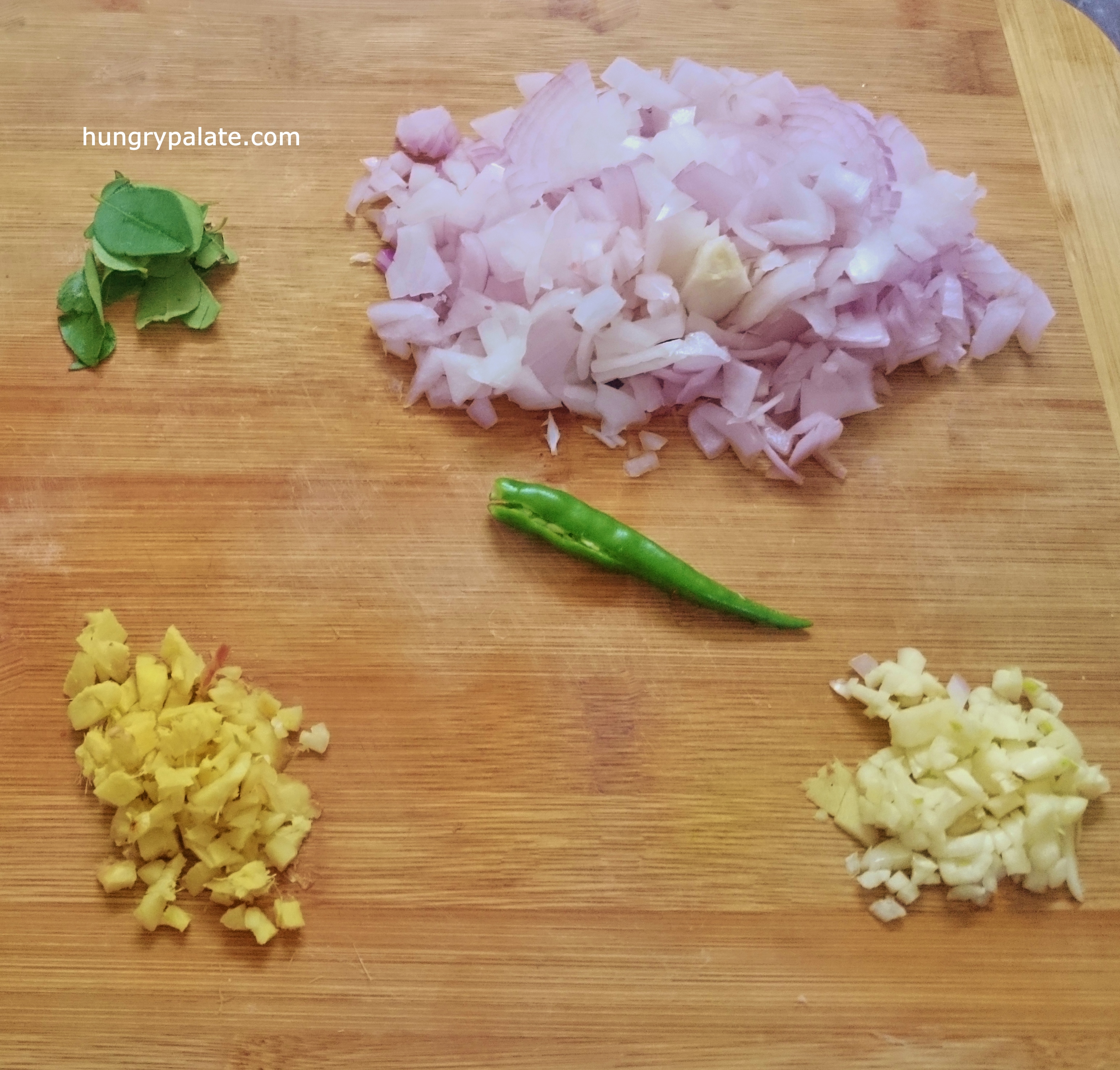 - Secondly, finely chop the onions, garlic, ginger, slit the chilly and keep aside.