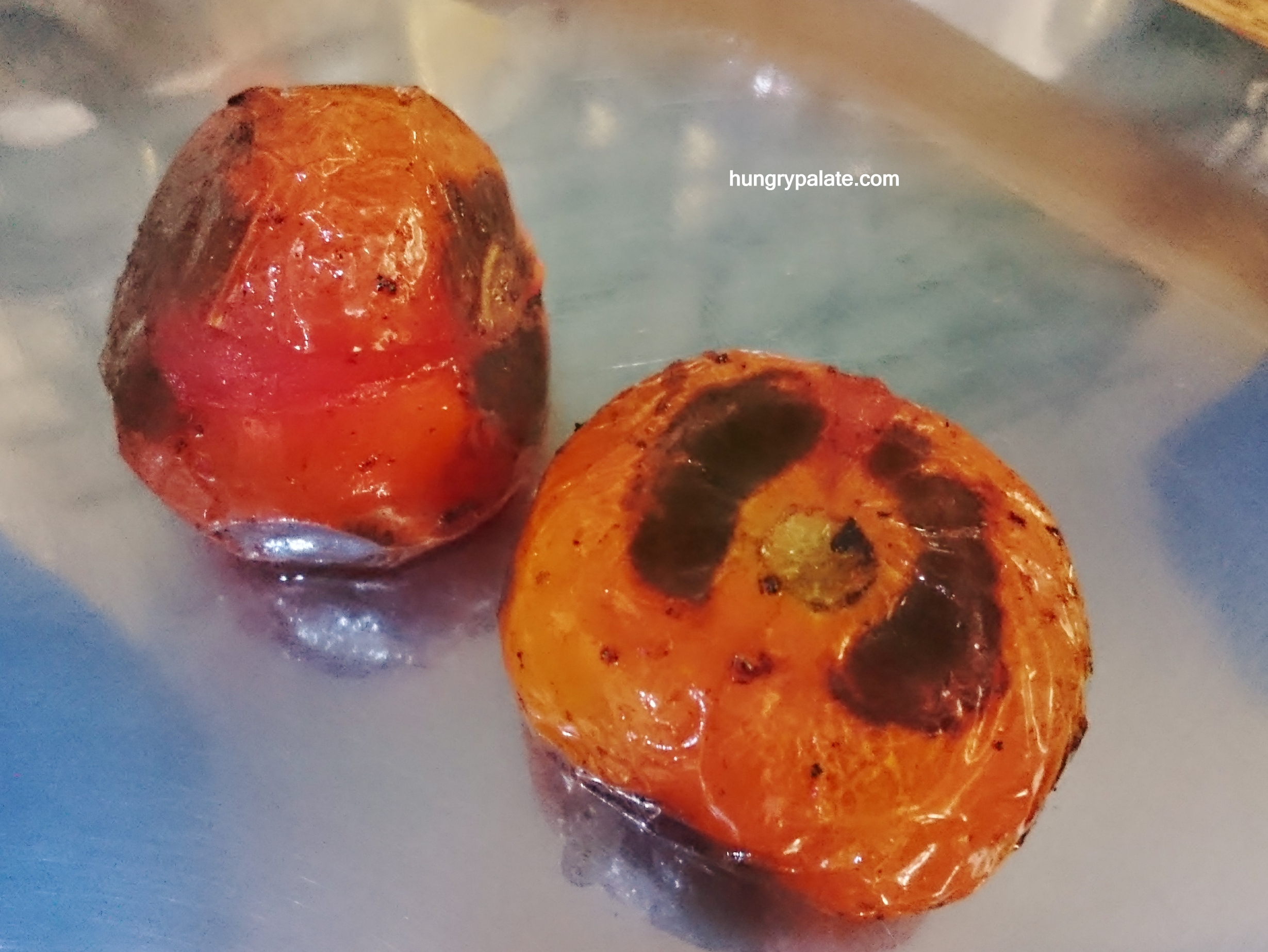 - Firstly, slightly cross cut the tomatoes, brush with little oil, place them on tawa and roast until the skin turns black.