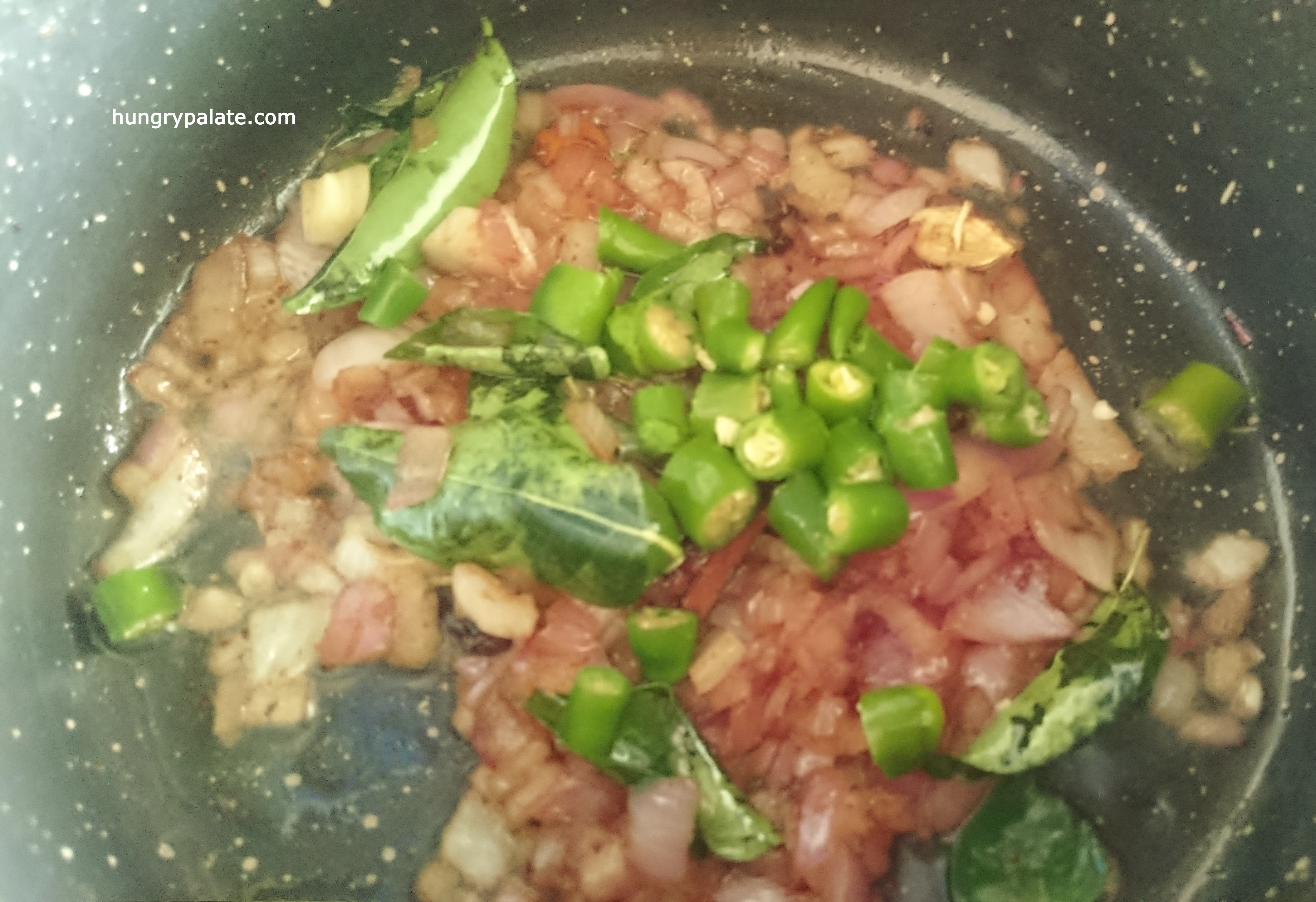- Once the onions turn translucent add in chopped green chilies and saute for 2 minutes.