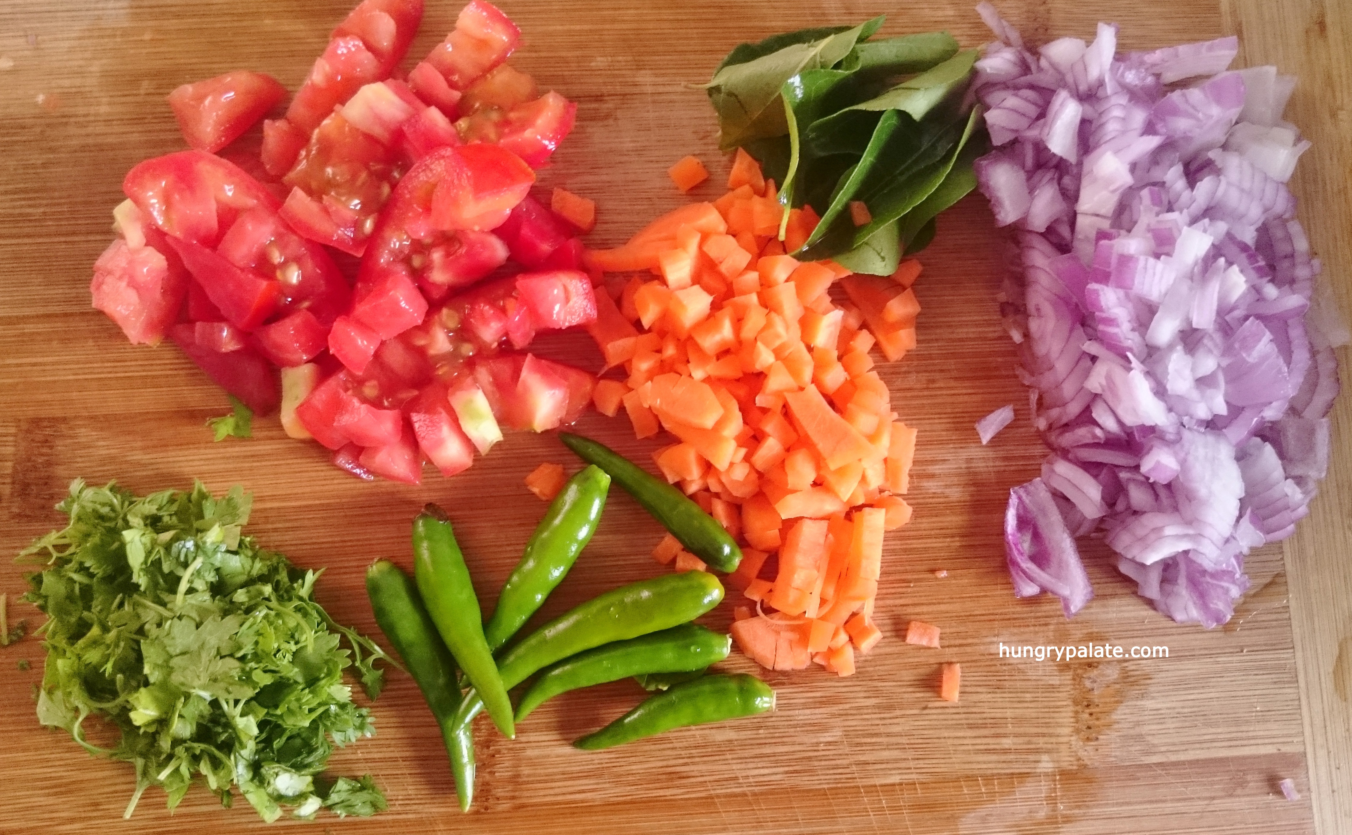 - Firstly, finely chop the onions, tomatoes, carrots, beans, green chilies, corianderĀ leaves and keep aside.