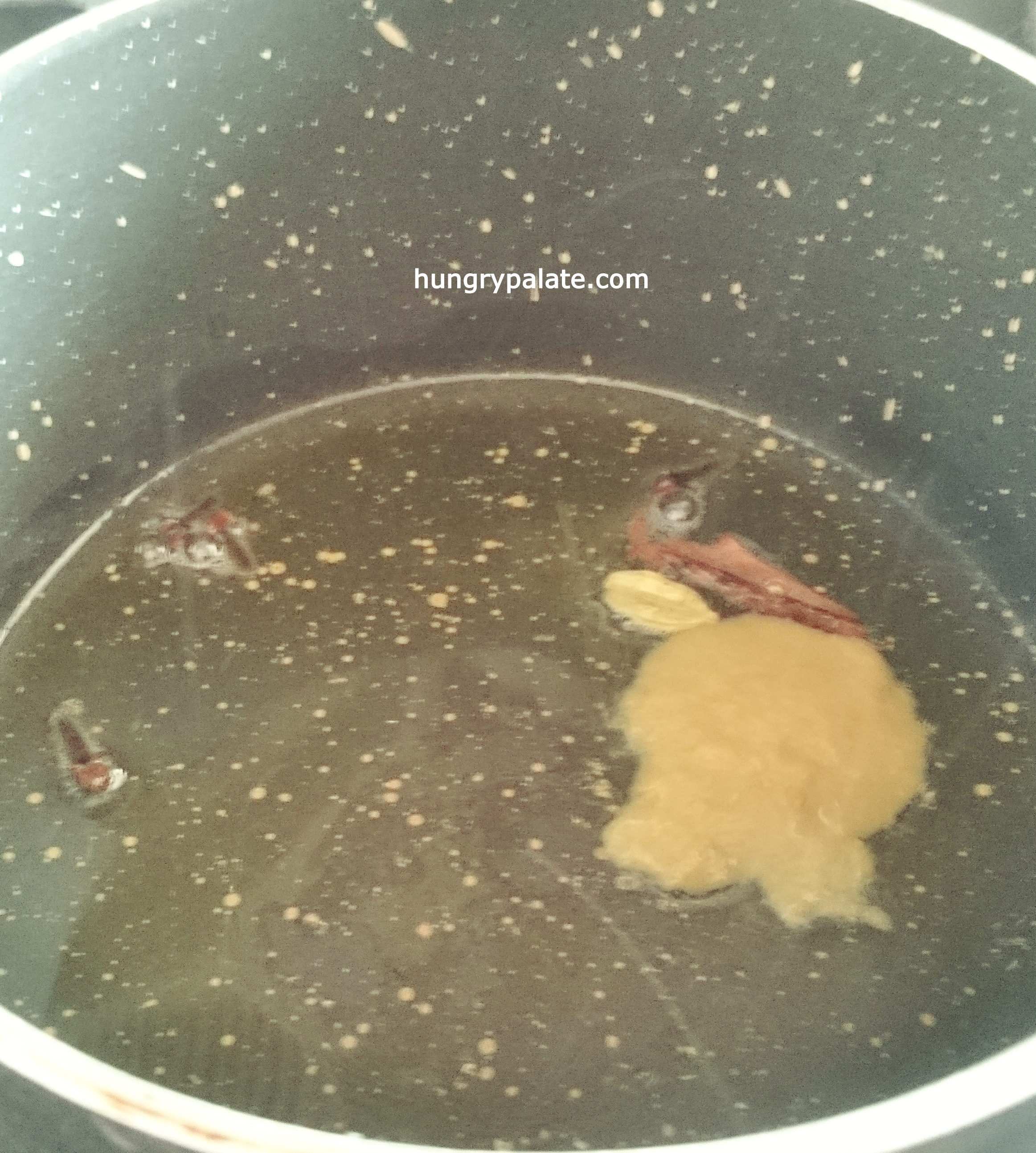 - Once the oil is hot, add in cloves, cinnamon, cardamom, ginger garlic paste and fry for 3 minutes.