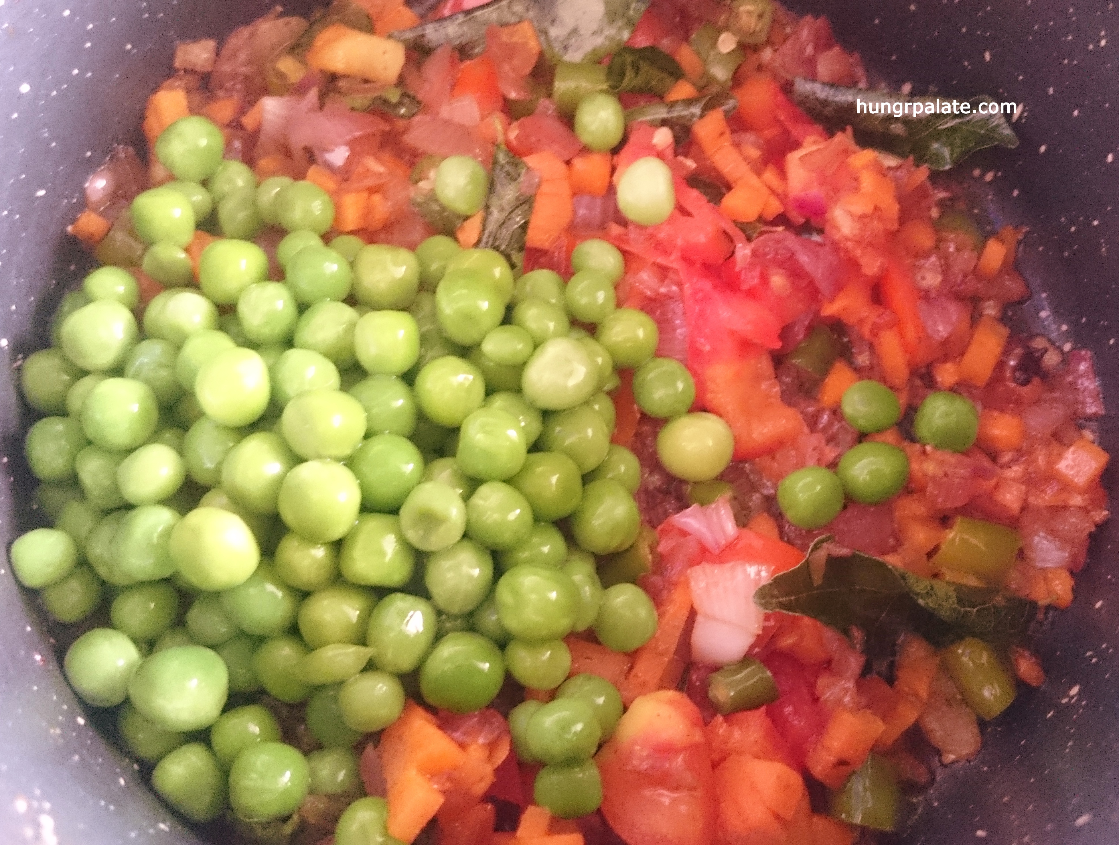 - Once the tomatoes turn mushy add in chopped carrots,Ā beans,1/2 teaspoon salt and fry for 5 minutes.
