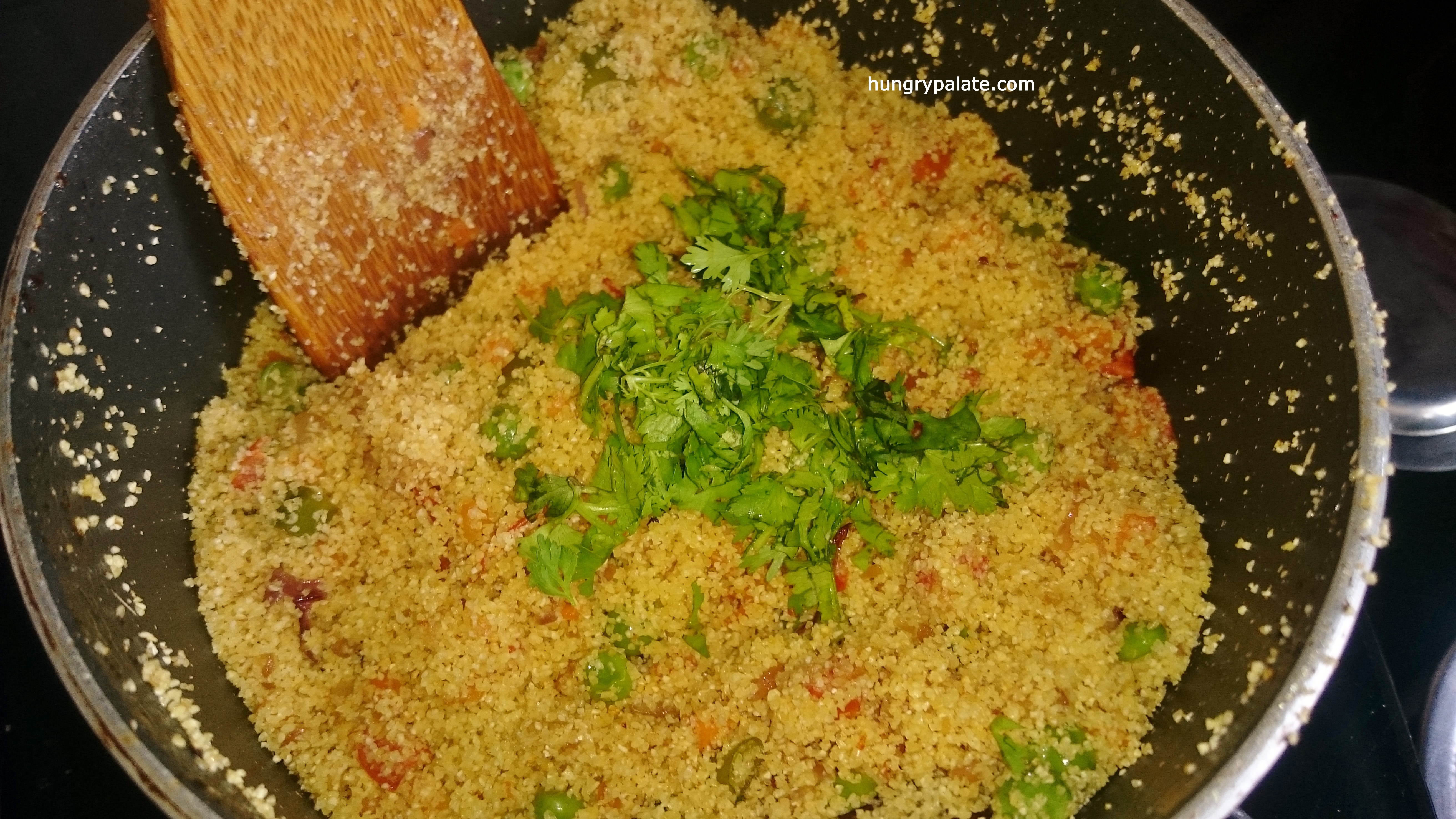 Rava Roasted rava - Once the rava is fried slightly, add in half of the chopped coriander and mix well.
